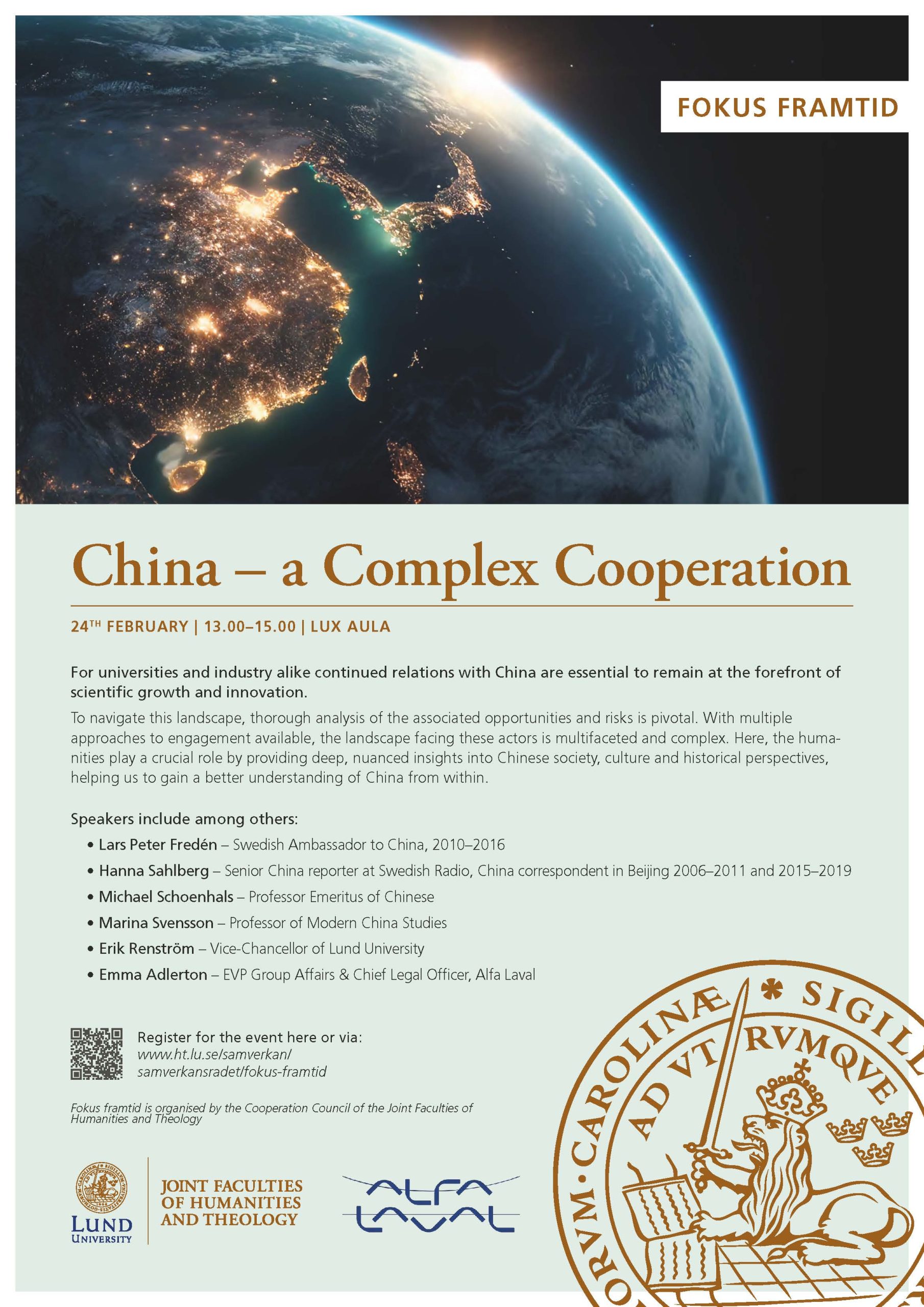 Seminariet presenterar dels en av våra inkommande gästprofessorer, Aynne Kokas, i en kort film, dels en mycket intressant kavalkad av presentatörer som kommer att belysa såväl möjligheterna och önskvärdheten i att i samarbete med kinesiska universitet och företag för att kunna befinna sig i framkant när det gäller vetenskap och innovation, men också risker samt en fördjupad förståelse av dessa frågor ur ett kinesiskt perspektiv: